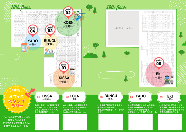 自由にオフィスを見学できるスタンプラリー形式で、新しいオフィス空間を楽しんでいただきました!!